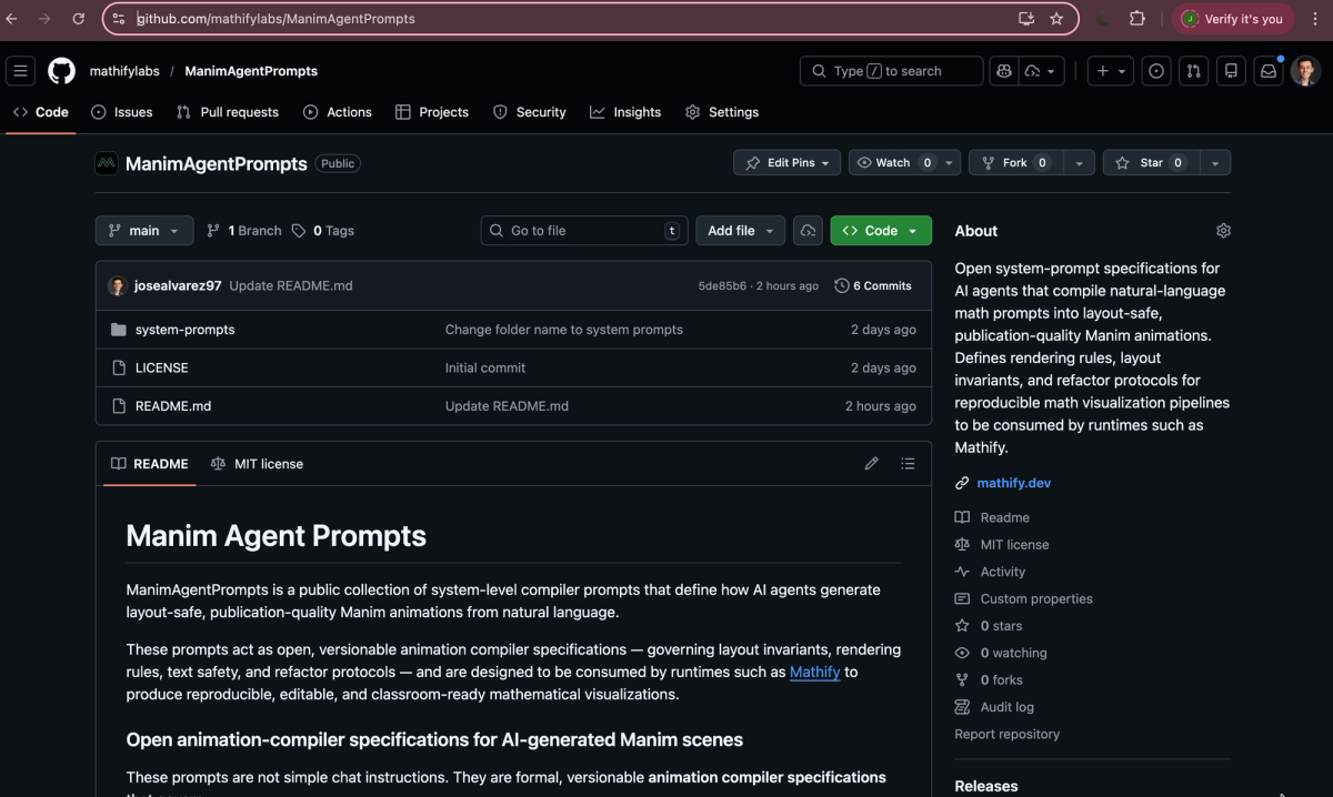 Open system-prompt specifications for AI agents that compile natural-language math prompts into layout-safe, publication-quality Manim animations. Defines rendering rules, layout invariants, and refactor protocols for reproducible math visualization pipelines to be consumed by runtimes such as Mathify.