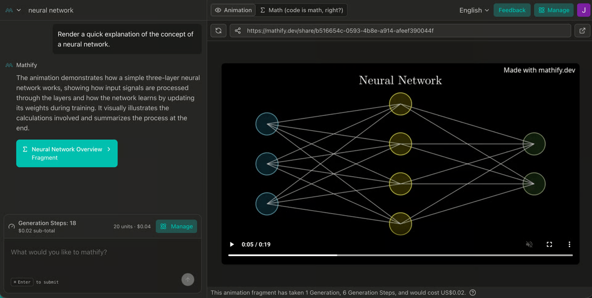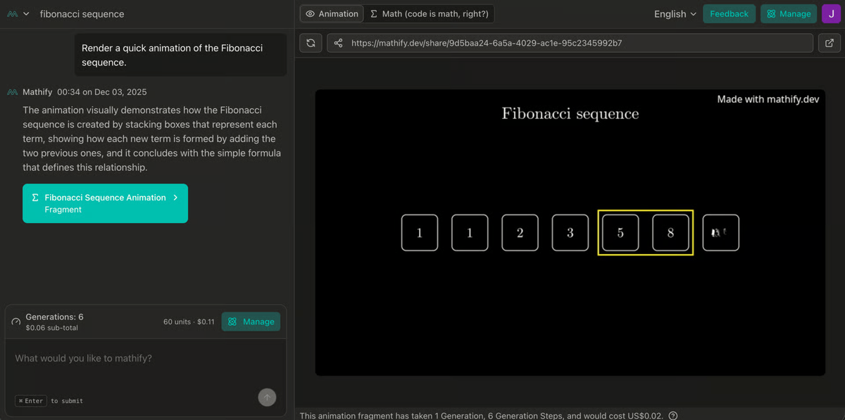 I’ve been working on something new, and I’m finally ready to show it: Mathify.dev, an AI tool that creates Manim-style mathematical animations from plain-language prompts.