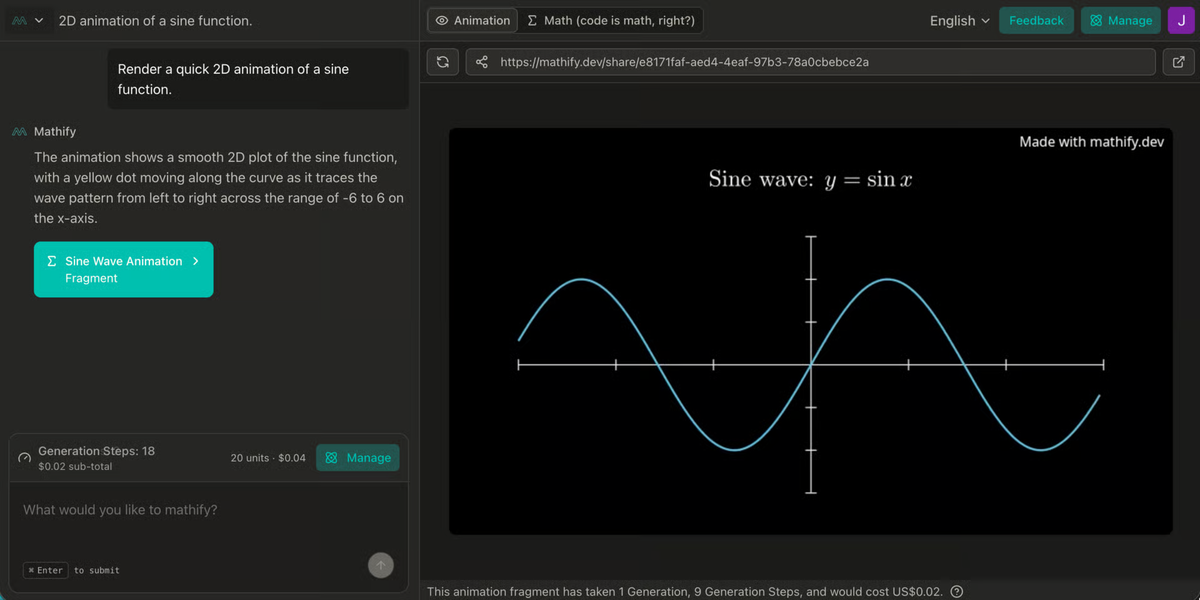 A few seconds later, Mathify generates the code, runs the render, and produces the animation. That’s the basic idea — fast, natural-language-driven mathematical visuals.