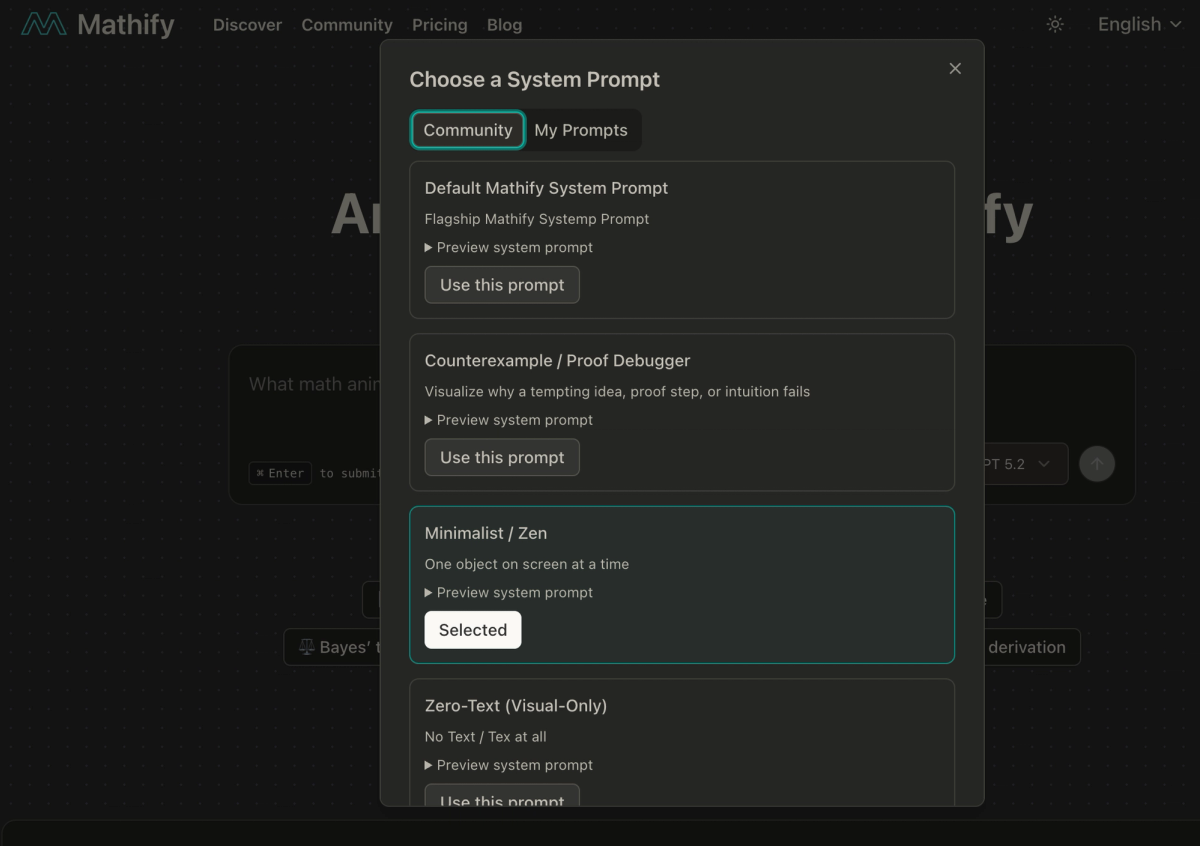 Up until now, Mathify has had a single default system prompt. That prompt contains a lot of guidelines for the AI model: how to structure animations, avoid overlaps, keep things readable, manage timing, camera framing, and so on. It’s general-purpose and works well for most cases.